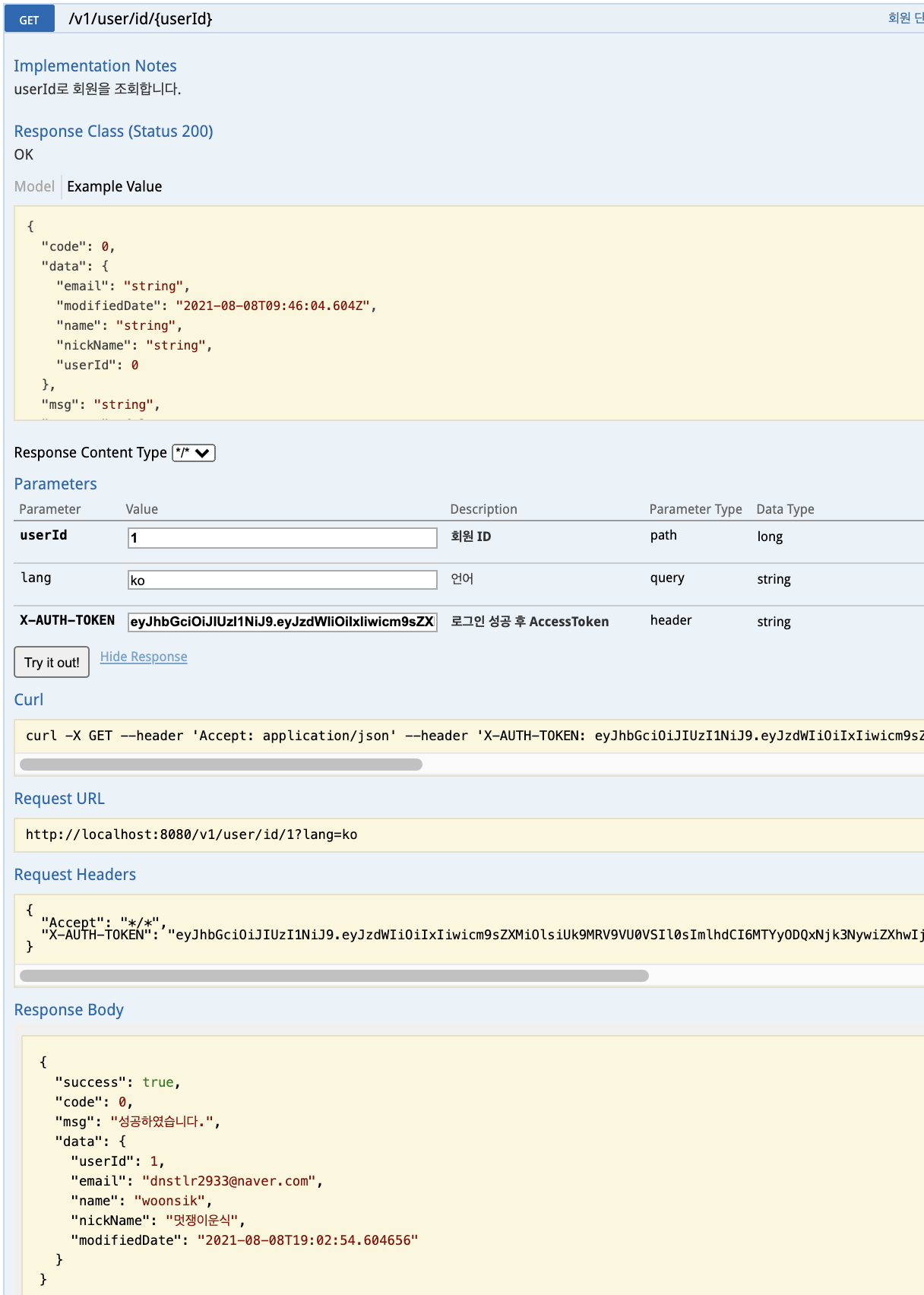 유효한 Jwt토큰을 설정해야만 User리소스를 사용할 수 있도록 Header에 X-AUTH-TOKEN을 인자로 받도록 선언