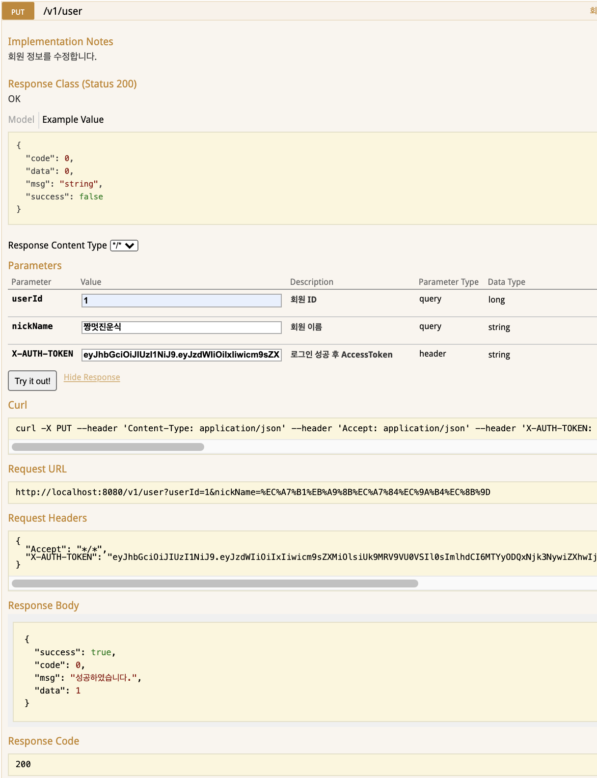 유효한 Jwt토큰을 설정해야만 User리소스를 사용할 수 있도록 Header에 X-AUTH-TOKEN을 인자로 받도록 선언